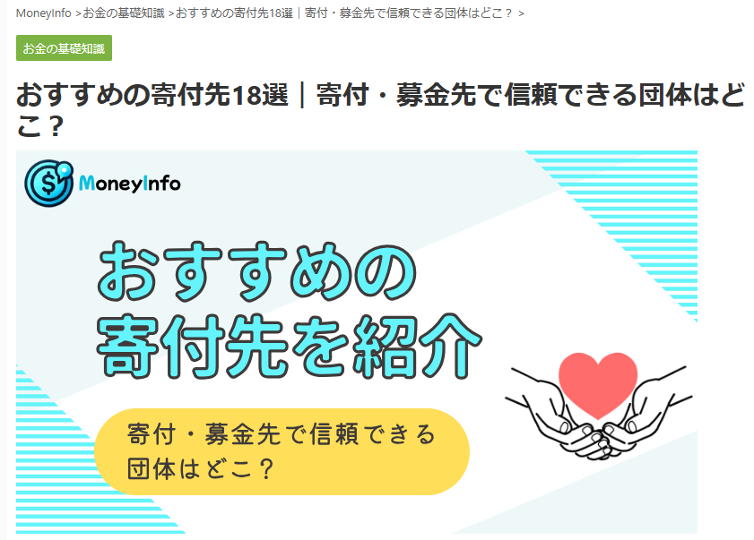 サイト内では、募金・寄附先を選ぶときのポイントなどが掲載されており、その中で当団体がご紹介されています。下記URLより、記事の内容がご覧いただけます。