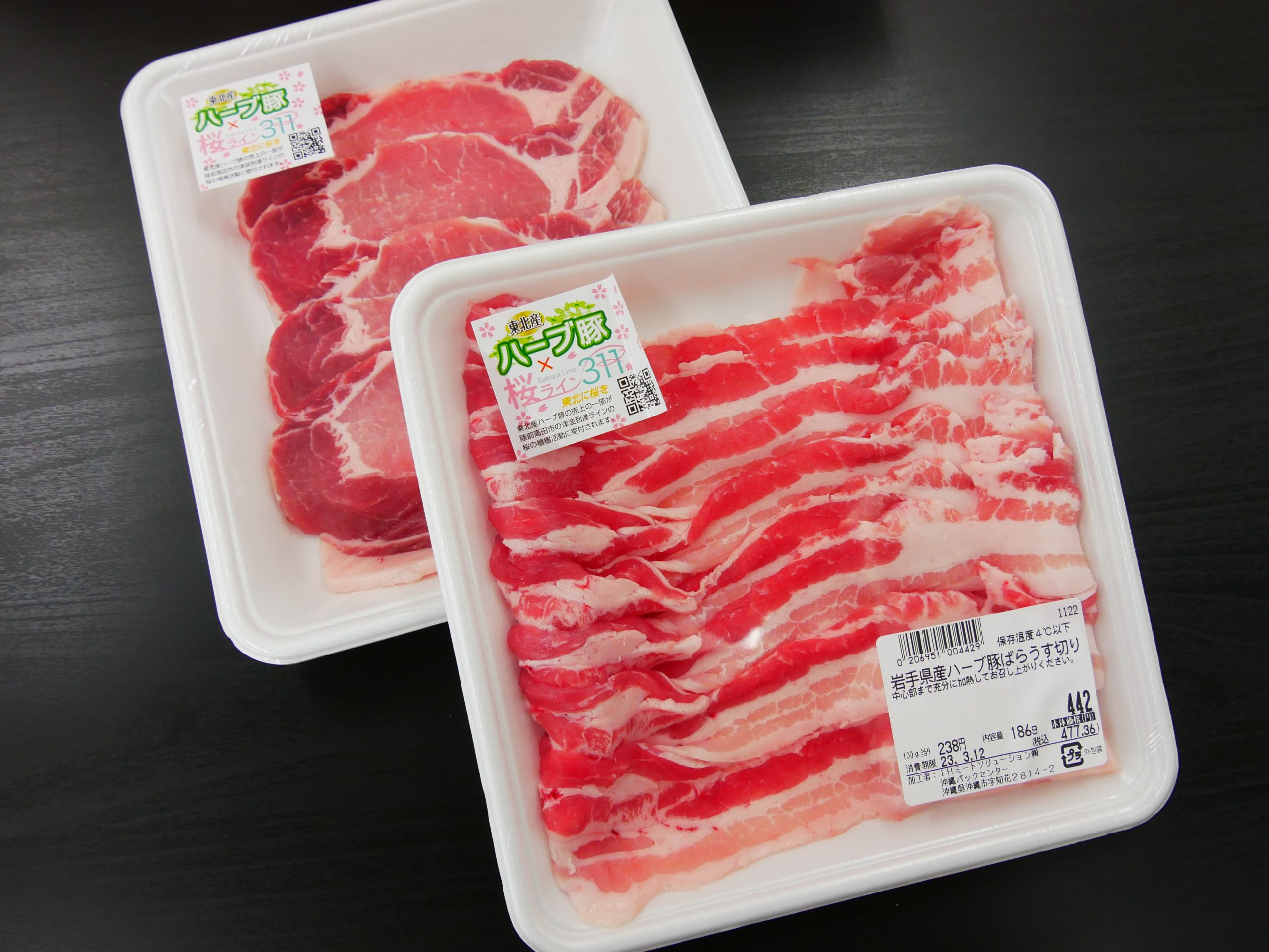 対象の商品には「ハーブ豚×桜ライン311」のコラボシールが貼られています。