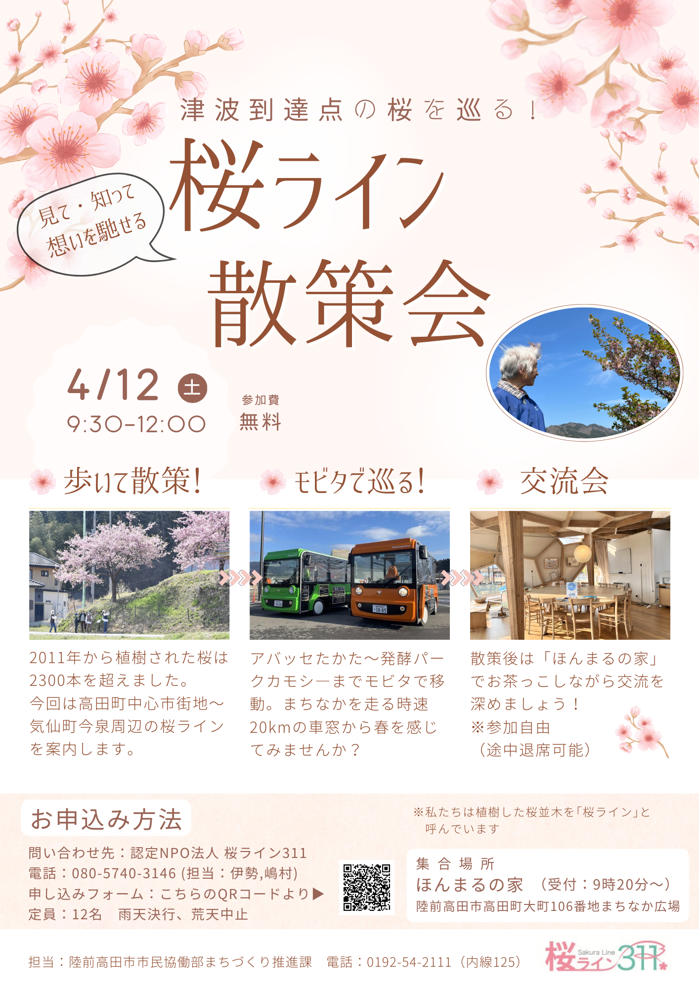 認定特定非営利活動法人 桜ライン311(代表理事:岡本翔馬(42))は、東日本大震災の教訓を後世に伝えるために、岩手県陸前高田市内の津波到達点170kmに1万7000本の桜を植樹する活動を行っています。